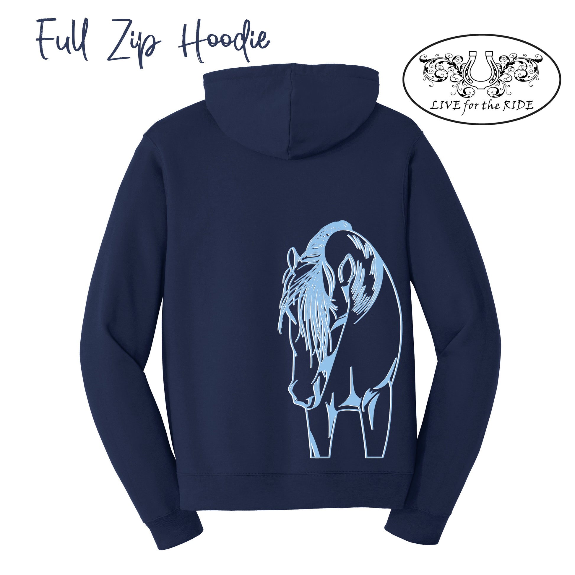 Meet your new go-to hoodie — where comfort meets artistry. The Cash design captures the quiet power and beauty of the horse in a hand-drawn minimalist line style, printed in soft sky-blue and white ink on a navy full zip hoodie.